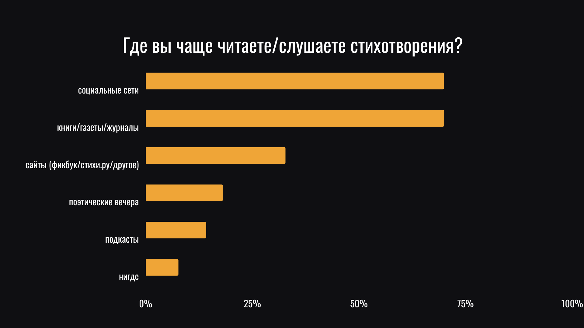Мы опросили представителей молодежи в возрасте 10-20 лет и выяснили, что большинство респондентов одинаково часто читают/слушают стихи в социальных сетях, книгах, газетах и журналах. Меньшей популярностью пользуются специализированные сайты (Фикбук, Стихи.ру), поэтические вечера и подкасты.