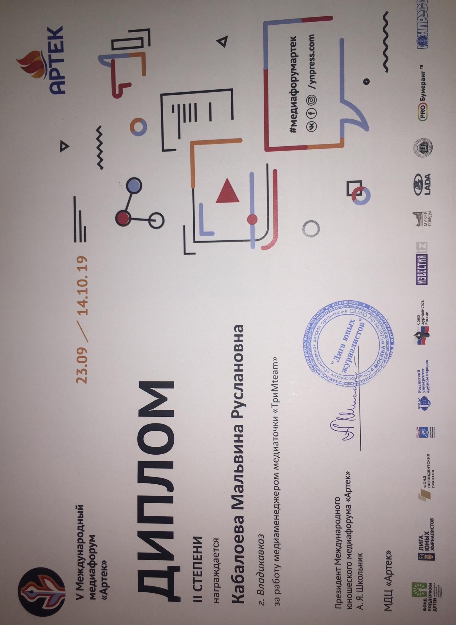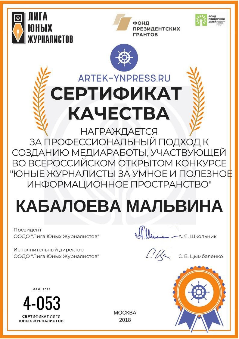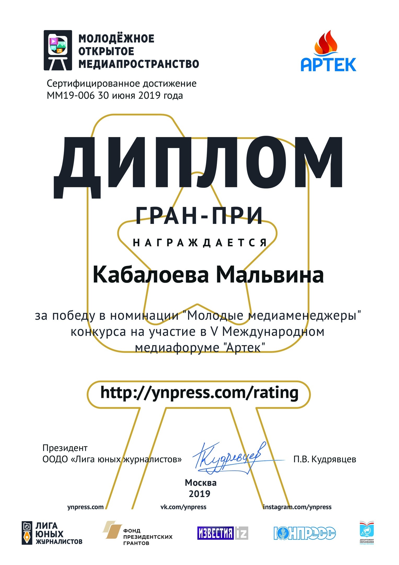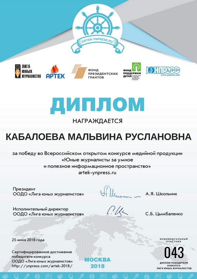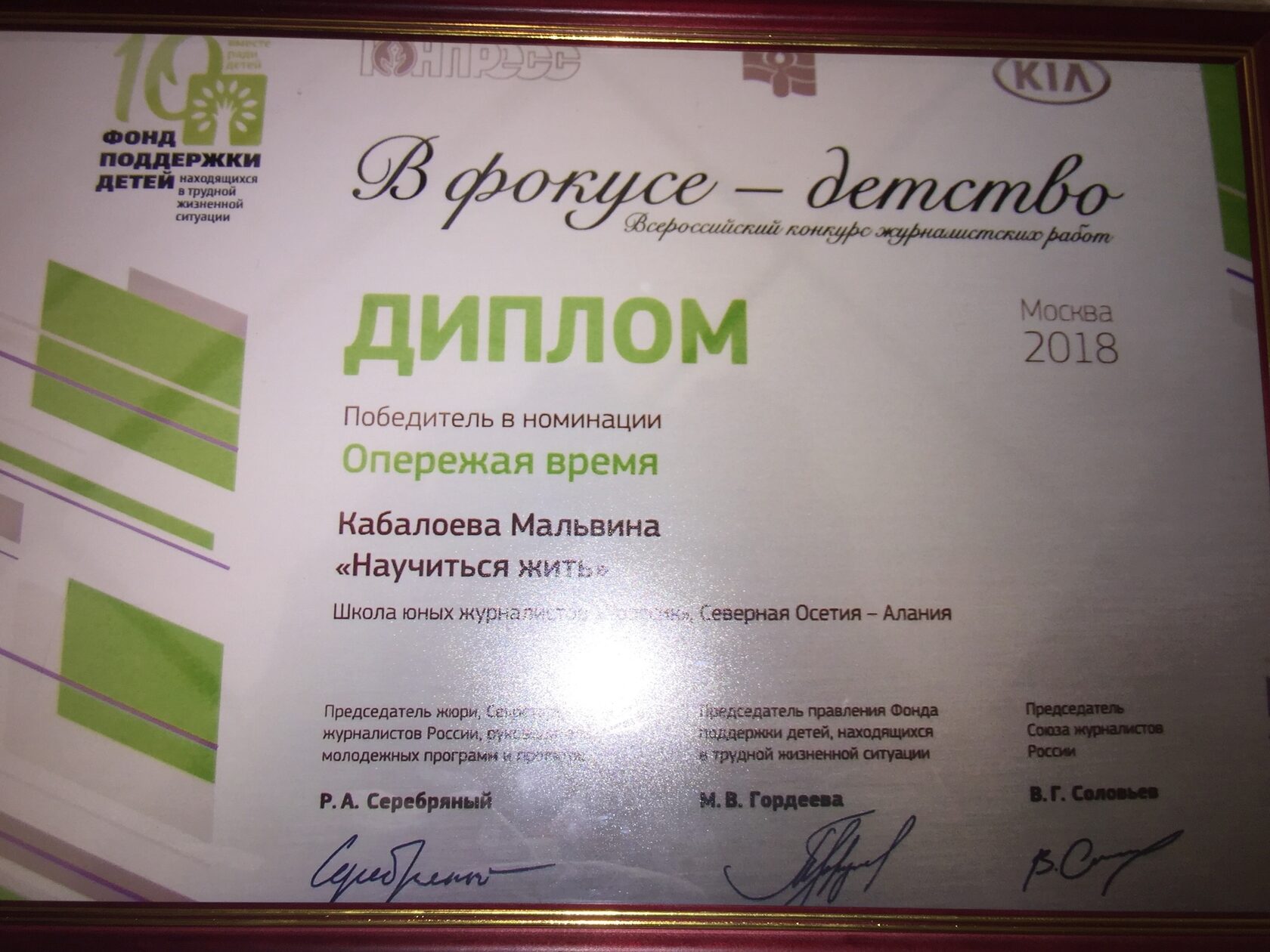 Победитель Всероссийских конкурсов по журналистике «В фокусе – детство», «Молодой медиаменеджер», «Юные журналисты за умное и полезное информационное пространство»